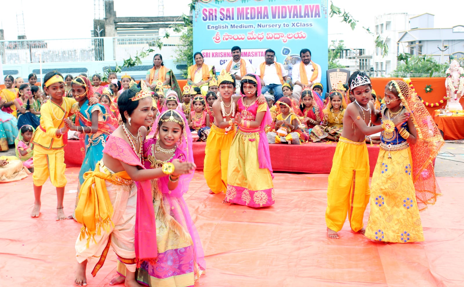 పోటీ పడి రాధాకృష్ణులు పెరుగుతో కూడిన కుండని పగలగొట్టారు. కార్యక్రమంలో ముఖ్య వక్తగా పాల్గొన్న విశ్వహిందూ పరిషత్ జిల్లా అధ్యక్షుడు ప్రశాంత్ కుమార్ మాట్లాడుతూ ఆంగ్ల మాధ్యమంలో చదువు నేర్చుకుంటున్నప్పటికి విద్యార్థులు దేశ సంస్కృతి, సంప్రదాయాలను మరవకూడదని సూచించారు. విద్యార్థి దశ నుంచే గీతా శ్లోకాలను పఠించాలని పేర్కొన్నారు. కరస్పాండెంట్ పెరుమాళ్ల వెంకట్ రెడ్డి మాట్లాడుతూ నల్లని వాడు, అల్లరివాడు, గోపికాలోలుడు, యశోద తనయుడు, యోగీశ్వరుడని పేరొందిన శ్రీకృష్ణుని జన్మదిన ఉత్సవాలను ఆనవాయితీగా పాఠశాలలో జరుపుతున్నట్లు తెలిపారు. కులమతాలకు అతీతంగా పాఠశాలల్లో అన్ని పండుగలను జరుపుటకు సహకరిస్తున్న తల్లిదండ్రులకు కృతజ్ఞతలు తెలిపారు. విద్యార్థుల సర్వతో ముఖాభివృద్ధె లక్ష్యంగా పాఠశాలలను నడుపుతున్నట్లు పేర్కొన్నారు. కార్యక్రమంలో ఉపాధ్యాయులు, విద్యార్థులు, తల్లిదండ్రులు పాల్గొన్నారు.