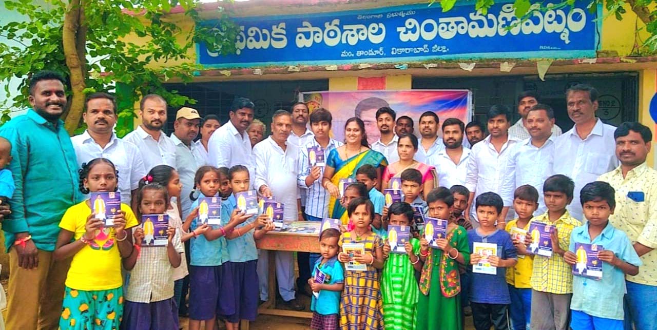 – విద్యార్థులకు పుస్తకాలు అందజేసిన తండ్రి, కుమారుడు