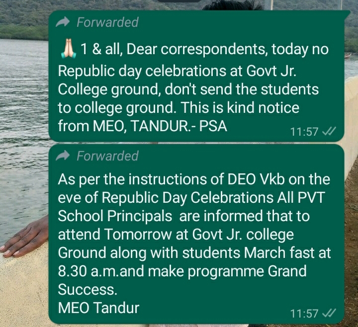 తాండూరు, దర్శిని ప్రతినిధి : వికారాబాద్ జిల్లా తాండూరులో జాతీయ పతాక కీర్తికి భంగం వాటిళ్లడం తీవ్ర దుమారమైంది. ఎంతో ప్రతిష్టాత్మకంగా నిర్వహించే సామూహిక జెండా వందన వేడుకలు రద్దు కావడం తీవ్ర విమర్శల వెళ్లవకు దారి తీసింది. ప్రతి యేడాది తాండూరు పట్టణంలోని ప్రభుత్వ జూనియర్ కళాశాల మైదానంలో స్వాతంత్య్ర దినోత్సవ, గణతంత్ర దినోత్సవ వేడుకలను సామూహికంగా నిర్వహించడం ఆనవాయితీ. ఉన్నతాధికారుల ఆదేశాల మేరకు తాండూరు తహ సీల్దార్ ఆధ్వర్యంలో సాముహిక వేడుకలు నిర్వహిస్తారు. ఈ సాముహిక వేడుకలలో గౌరవ వందనం స్వీకరించడం, సాంస్కృతిక కార్యక్రమాల ప్రదర్శన, గణతంత్ర దినోత్సవంపై సందేశాలు ఇవ్వడం సంప్రదాయం. కాని గురువారం గణతంత్ర దినోత్సవ వేడుకలను ఆర్డీఓ అశోక్ కుమార్ ద్వారా జాతీయ పతాకావిష్కరణ గావించి మమః అనిపించారు. అయితే ఒకరోజు ముందు సామూహిక వేడుకలను ఘనంగా నిర్వహించాలని విద్యాశాఖ అధికారులు ప్రభుత్వ, ప్రైవేటు పాఠశాలకు సందేశాలను పంపించారు. సరిగ్గా గణతంత్ర దినోత్సవ వేడుకల గంట ముందు అనూహ్యంగా కార్యక్రమాలను రద్దు చేశారు. విద్యార్థులను ఎవ్వరిని సామూహిక వేడుకలకు తీసుకరావద్దని ఆఘ మేఘాల మీద మేసేజ్ లు, ఫోన్లు చేసి వేడుకలను నిలిపివేశారు.