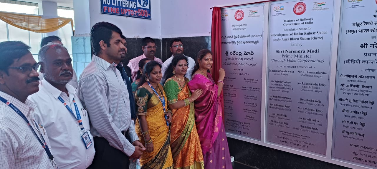 తాండూరు, దర్శిని ప్రతినిధి: దేశంలోని రైల్వే స్టేషన్ల ఆధునీకరణ కోసం కేంద్ర ప్రభుత్వం ప్రారంభించిన అమృత్ భారత్ స్టేషన్ కింద వికారాబాద్ జిల్లాలోని తాండూరు రైల్వే స్టేషన్కు అరుదైన గౌరవం దక్కింది. కేంద్రం చొరవతో దక్కిన అందలంతో పురోగతి దిశగా అడుగులు వేస్తోంది. అమృత్ భారత్ స్టేషన్ పథకంలో భాగంగా ఆదివారం కేంద్ర ప్రభుత్వం దేశంలోని 508 రైల్వేస్టేషన్లను నవీకరణ పనులకు శ్రీకారం చుట్టింది. ఇందులో భాగంగా తాండూరు రైల్వేస్టేషన్ పురోగతి పనులకు ప్రధాన మంత్రి నరేంద్రమోడీ వర్చవల్గా శంకుస్థాపన చేశారు. అమృత్ భారత్ కింద రూ. 24.4 కోట్లతో చేపడుతు పురోగతితో తాండూరు రైల్వేస్టేషన్కు రాజయోగం వచ్చిందని కార్యక్రమానికి హాజరైన నేతలు అభివర్ణించారు. ఈ కార్యక్రమానికి మున్సిపల్ చైర్ పర్సన్ స్వప్న పరిమళ్ ముఖ్య అతిథిగా హాజరై అభివృద్ధి పనుల బోర్డును ఆవిష్కరించారు.
