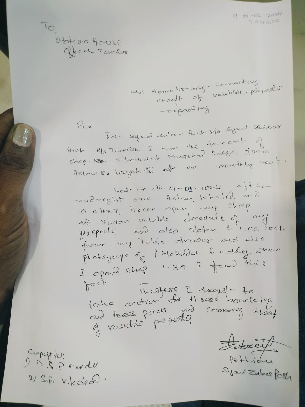 దౌర్జన్యంగా కార్యాలయంలో ఉన్న తన వ్యాపారంతో పాటు ఇతర విలువైన పత్రాలు, సుమారు రూ.1లక్ష నగదును ఎత్తుకెళ్లిపోయారని తెలిపారు. అందులో ఎమ్మెల్సీ మహేందర్ రెడ్డి చిత్రపటం, ఎలక్ట్రానిక్ వస్తువులు కూడా ఉన్నాయన్నారు. గమనించిన స్థానికులు సమాచారం అందించడంతో ఆఫీసును సందర్శించగా విషయం తెలిసిందన్నారు. ఆఫీసుకు తాళం వేసినా కూడా ధ్వంసం చేసి.. దౌర్జన్యం ప్రదర్శించారని ఆందోళన వ్యక్తం చేశారు. కక్ష్యపూరితంగా వ్యవహరించిన వ్యక్తులపై తాండూరు పట్టణ పోలీసులకు ఫిర్యాదు చేయడం జరిగిందన్నారు. పోలీసు అధికారులు స్పందించి సత్వర న్యాయం చేయాలని కోరారు.