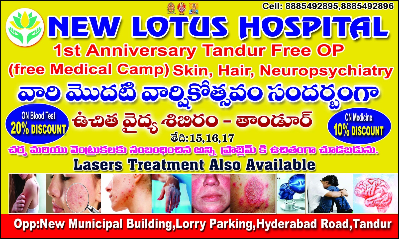 తాండూరు, దర్శిని ప్రతినిధి : తాండూరు ప్రజలకు న్యూ లోటస్ హస్పిటల్ యజమాన్యం శుభవార్త చెప్పింది. పట్టణంలోని నూతన మున్సిపల్ కార్యాలయం ముందు ఉన్న హస్పిటల్లో మూడు రోజులు ఉచిత వైద్య శిబిరం నిర్వహిస్తున్నట్లు ప్రకటించారు.
