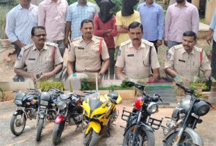 హాండిల్ లాక్ లేని బైకులే టార్గెట్..! – జల్సాలకు అలవాటు పడి చోరీలు – పోలీసులకు అడ్డంగా దొరికిన దొంగలు – నలుగురు నిందితుల్లో ఇద్దరు మైనర్లు – చోరీ చేసిన ఆరు బైకుల స్వాదీనం – వివరాలు వెల్లడించిన తాండూరు డీఎస్పీ తాండూరు, దర్శిని ప్రతినిధి : హ్యాండిల్ లాక్ లేని బైకులను టార్గెట్ చేసుకుని చోరీలకు పాల్పడుతున్న దొంగల ఆటకట్టించారు తాండూరు పోలీసులు. ఐదు బైకులను చోరీ చేసిన దొంగలు మరో బైకును చోరీ … Continue reading హాండిల్ లాక్ లేని బైకులే టార్గెట్..!