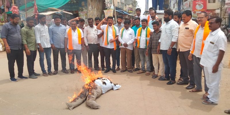 రాహుల్ గాంధీ క్షమాపణ చెప్పాలి – బీజేపీ రాష్ట్ర కార్యవర్గ సభ్యులు యు.రమేష్ కుమార్ – తాండూరులో దిష్టిబొమ్మ దహనం తాండూరు, దర్శిని ప్రతినిధి : హిందువుల మనోభావాలు దెబ్బతీసేలా వాఖ్యలు చేసిన కాంగ్రెస్ ప్రతిపక్ష నేత రాహుల్ గాంధీ క్షమాపణ చెప్పాలని బీజేపీ నేతలు డిమాండ్ చేశారు. సోమవారం పార్లమెంట్ సమావేశంలో రాహుల్ గాంధీ హిందువులకు వ్యతిరేకంగా, మనోభావాలు దెబ్బతీసేలా చేసిన వ్యాఖ్యలను ఖండించారు. మంగళవారం తాండూరు పట్టణంలోని అంబేద్కర్ చౌరస్తాలో బీజేపీ నేతలు నిరసన … Continue reading రాహుల్ గాంధీ క్షమాపణ చెప్పాలి