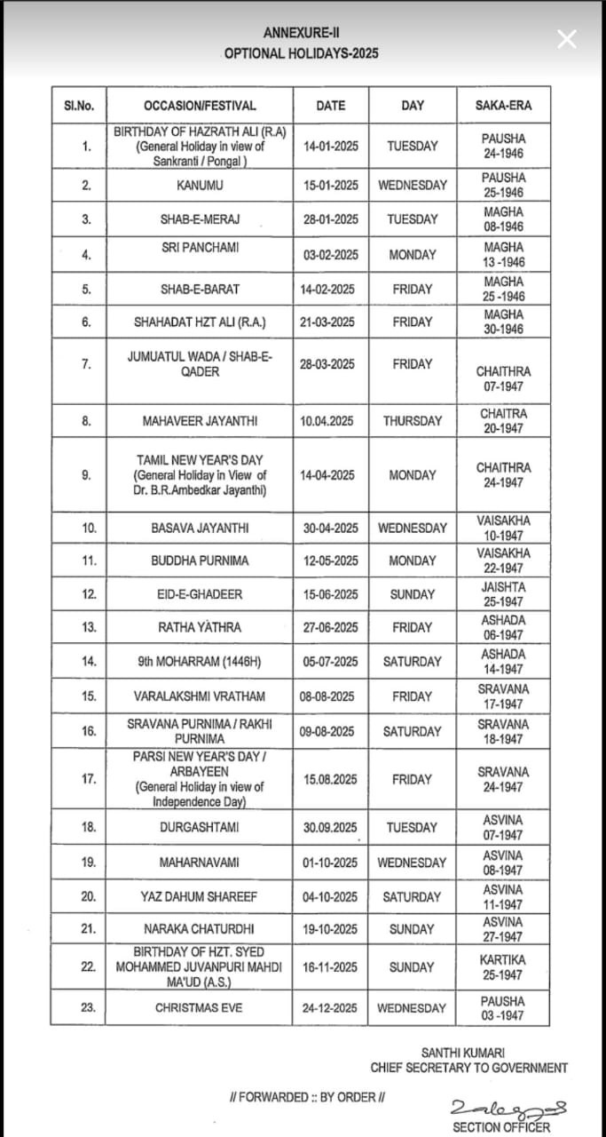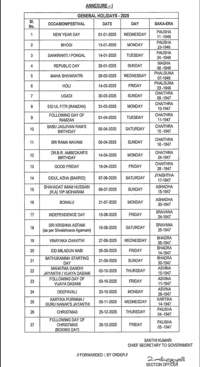 హైదరాబాద్, దర్శిని ప్రతినిధి : వచ్చే 2025లో రానున్న సెలవులను తెలంగాణ సర్కారు ప్రకటించింది. రాష్ట్ర ప్రభుత్వ ప్రధాన కార్యదర్శి శాంతికుమారి ఉత్తర్వులు జారీ చేశారు. 2025లో సాధారణ, ఐచ్ఛిక సెలవుల జాబితాను విడుదల చేసింది. దీని ప్రకారం.. 2025లో మొత్తంగా 27 సాధారణ సెలవులు, 23 ఐచ్ఛిక సెలవులు ఉన్నట్లు రాష్ట్ర ప్రభుత్వం ప్రకటించింది. సెలవుల జాబితాను కింద చూడవచ్చు…