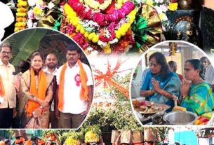 సల్లంగా చూడు ఎల్లమ్మ తల్లీ..! – వైభోగంగా రేణుకా నాగ ఎల్లమ్మ జాతర – దర్శించుకున్న మున్సిపల్ చైర్ పర్సన్, మాజీ జెడ్పీటీసీ ప్రమోదిని రెడ్డి – బోనాలతో భక్తుల నవేద్యాల సమర్పణ తాండూరు, దర్శిని ప్రతినిధి : సల్లంగా చూడు ఎల్లమ్మ తల్లీ అంటూ భక్తులు తాండూరు పట్టణం నెహ్రు గంజ్ ఆవరణలో వెలసిన శ్రీ రేణుకా నాగ ఎల్లమ్మను వేడుకున్నారు. శుక్రవారం అమ్మవారి జాతర ఉత్సవాలు వైభవంగా జరిగాయి. జాతర ఉత్సవాలను పురస్కరించుకుని అమ్మవారిని … Continue reading సల్లంగా చూడు ఎల్లమ్మ తల్లీ..!