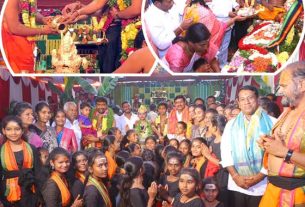 శరణు.. శరణు.. శరణం అయ్యప్పా..! – అంగరంగ వైభవంగా అయ్యప్ప పడిపూజ – పడిపూజలో పాల్గొన్న ఎమ్మెల్యే మనోహర్ రెడ్డి తాండూరు, దర్శిని ప్రతినిధి : శరణు.. శరణు.. శరణం అయ్యప్పా.. అనే శరణు గోషతో తాండూరు పట్టణం శివాజీ చౌరస్తాలోని శ్రీ సాయిమేధా విద్యాలయం మార్మోగింది. ఆదివారం సాయిమేథా స్కూల్ కరస్పాండెంట్ పెరుమాళ్ల వెంకట్ రెడ్డి ఆధ్వర్యంలో అయ్యప్ప స్వామి మహా పడిపూజ అంగరంగ వైభవంగా కొనసాగింది. ఈ పూజకు వివిధ ప్రాంతాల నుంచి మాల … Continue reading శరణు.. శరణు.. శరణం అయ్యప్పా..!