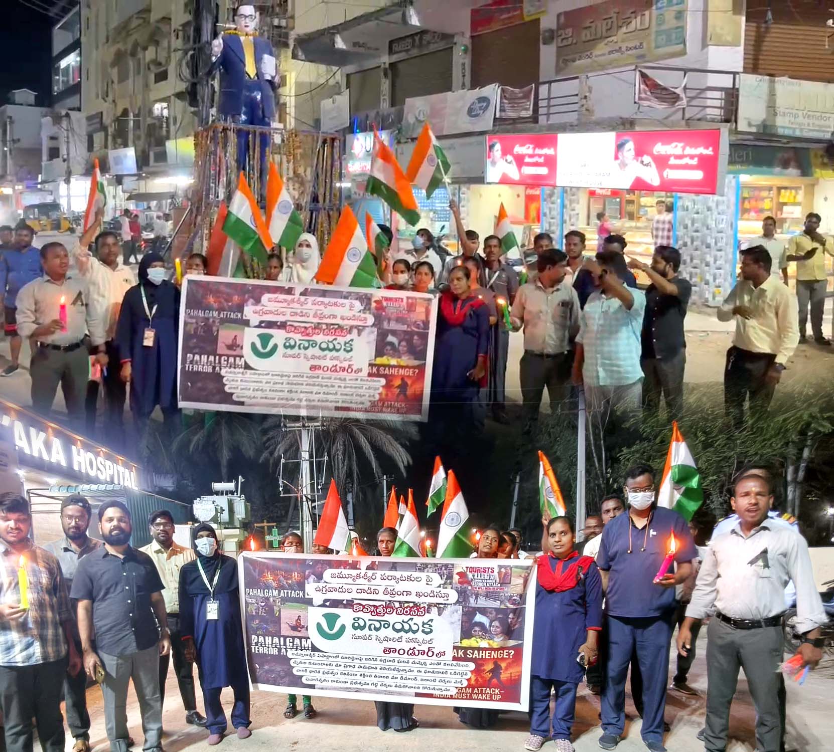 ఆసుపత్రి నిర్వహకులు, మార్కెట్ కమిటీ మాజీ చైర్మన్ విఠల్ నాయక్ ఆదేశాలతో ఆసుపత్రి ఎండి డా.చందులాల్ ఆధ్వర్యంలో డా.విజయ్ కుమార్, వైద్యులు, సిబ్బంది కొవ్వొత్తులు ప్రదర్శిస్తూ ఆసుపత్రి నుంచి పట్టణంలోని అంబేద్కర్ చౌరస్తా మీదుగా ర్యాలీ కొనసాగించారు. ఈ సందర్భంగా ఉగ్రదాడికి వ్యతిరేకంగా నినాదాలు చేశారు. మృతులకు నివాళులు అర్పించారు. అనంతరం పలువురు మాట్లాడుతూ జమ్మూ కాశ్మీర్లోని పర్యాటకుపై తీవ్రవాదులు దాడులు చేయడం పిరికిపంద చర్య అన్నారు. ఉగ్రదాడికి పాల్పడిన వారిని గుర్తించి కేంద్రం కఠినంగా శిక్షించాలని డిమాండ్ చేశారు. బాధిత కుటుంబాలను ఆదుకోవాలని కోరారు. ఈ కార్యక్రమంలో ఆసుపత్రి సిబ్బంది పాల్గొన్నారు.