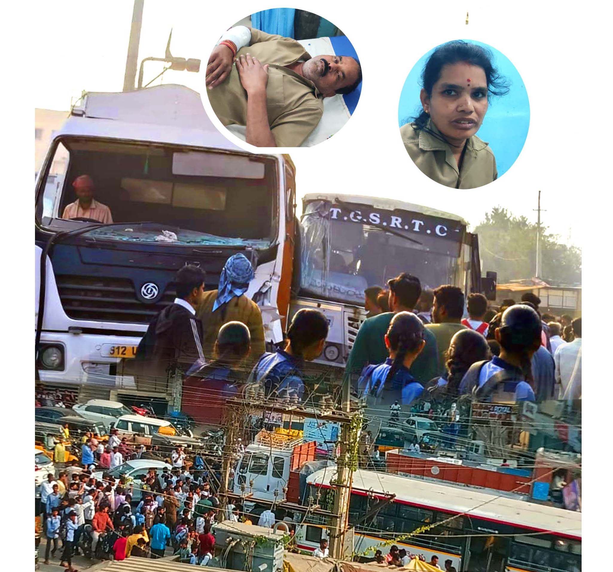 ఇందుకు సంబంధించిన వివరాలిలా ఉన్నాయి.. తాండూరు ఆర్టీసీ డీపోకు చెందిన బస్సు మెట్లకుంటకు బయల్దేరింది. బస్సు డ్రైవర్ నారాయణ, కండక్టర్ యాదమ్మలు ప్రయాణికులతో డీపో గేటు నుంచి బయటకు వస్తుండగా కోడంగల్ వైపునుంచి వస్తన్న ఓ భారీ లారీ ఆర్టీసీ బస్సును ఢీ కొట్టింది. అతివేగంగా రావడంతో బస్సును అలాగే ముందకు లాక్కెళ్లింది. ఈ ఘటనతో బస్సులో ఉన్న ప్రయాణికులు ఉక్కిరి బిక్కిరి అయ్యి భయాందోళనకు గురయ్యారు. బస్సు, లారీ ఆగిన వెంటనే ప్రయాణికులు అందులో నుంచి పరుగులు పెట్టారు.