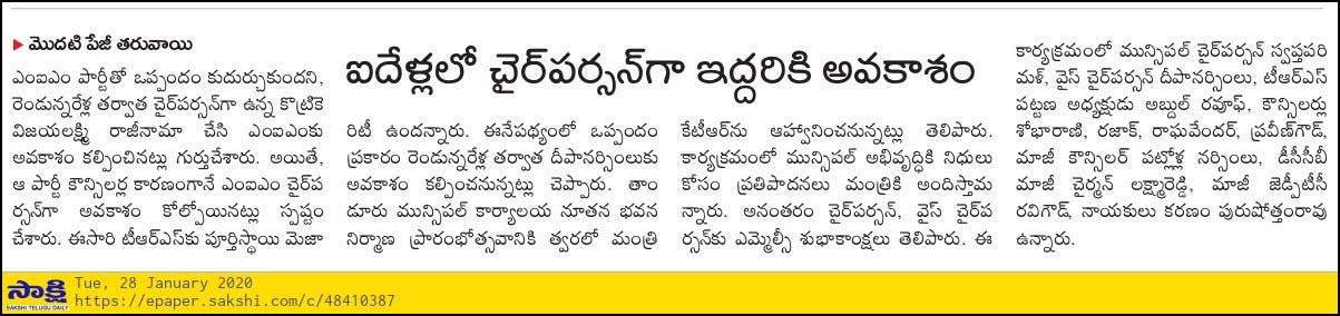 తాండూరు, దర్శిని ప్రతినిధి : తాండూరు మున్సిపల్ చైర్ పర్సన్ పీఠంపై ఒప్పంద రాజకీయ వ్యవహారం మరింత ముదురుతోంది. చైర్ పర్సన్గా కొనసాగుతున్న స్వప్న పరిమళ్ దిగిపోవాల్సిందే అనే అభిప్రాయాలు వ్యక్తం చేసే నాయకుల సంఖ్య పెరిగిపోతోంది. తాజాగా టీఆర్ఎస్ సీనీయర్ నాయకులు రాజుగౌడ్ మున్సిపల్ చైర్ పర్సన్ పీఠం ఒప్పందంపై స్పందించారు. ఈ సందర్భంగా ఆయన దర్శిని ప్రతినిధితో మాట్లాడుతూ మున్సిపల్ చైర్ పర్సన్ పదవిపై స్వప్న పరిమళ్, వైస్ చైర్మన్ పట్లోళ్ల దీపా నర్సింలు మద్య ఒప్పందం జరిగిందని గుర్తుచేశారు. 2020 జనవరిలో వచ్చిన ఎన్నికల ఫలితాల అనంతరం ప్రస్తుత ఉమ్మడి రంగారెడ్డి జిల్లా ఎమ్మెల్సీ మహేందర్ రెడ్డి ఈ ఒప్పందాన్ని ప్రకటించారని గుర్తుచేశారు. అప్పట్లో వచ్చిన మీడియా కథకాలను కూడ దర్శిని ప్రతినిధికి విడుదల చేశారు. ఐదేళ్ల పదవి కాలాన్ని స్వప్న పరిమళ్, పట్లోళ్ల దీపా నర్సింలు పంచుకుంటారని ఎమ్మెల్సీ చేసిన వాఖ్యలను గుర్తుచేశారు. అప్పట్లో జరిగిన మున్సిపల్ ఎన్నికల్లో ఈ రెండున్నరేళ్ల ఒప్పందాలు జరిగాయని స్వయంగా ఎమ్మెల్సీ ప్రకటించారని తెలిపారు. వికారాబాద్ జిల్లాలో కూడ రెండున్నరేళ్ల ఒప్పందం జరిగిందని ఎమ్మెల్సీ చెప్పినట్లు రాజుగౌడ్ తెలిపారు. 2014లో టీఆర్ఎస్, ఎంఐఎం మద్య జరిగిన అగ్రిమెంట్ను ఉదహరించి వివరించారని స్పష్టం చేశారు. ఇటీవల ఎమ్మెల్సీ మహేందర్ రెడ్డి తన నివాసంలో చైర్ పర్సన్ ఐదేళ్లు కొనసాగుతారని చేసిన వాఖ్యలు ద్వంద వైఖరిని తెలియజేస్తున్నాయని అభిప్రాయ పడ్డారు. … ఇంకా ఉంది…