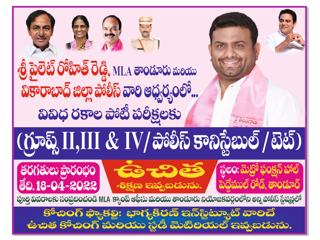 తాండూరు, దర్శిని ప్రతినిధి: తాండూరు ప్రాంతంలోని నిరుద్యోగ యువతకు ఉచిత అందించే కోచింగ్ను సద్వినియోగం చేసుకుని కోలువులు సాధించాలని ఎమ్మెల్యే పైలెట్ రోహిత్ రెడ్డి ఆకాంక్షించారు. శుక్రవారం తాండూరు ఎమ్మెల్యే క్యాంపు కార్యాలయ వేదికగా స్థానిక నిరుద్యోగులకు ఎమ్మెల్యే రోహిత్ రెడ్డి తీపికబురు అందించారు. ఈనెల 18 నుంచి తాండూరులో పోలీస్ కానిస్టేబుల్, గ్రూపు 1,2,3,4తో పాటు టెట్ అభ్యర్థులకు ఉచితంగా కోచింగ్ అందిస్తున్నట్లు ప్రకటించారు. పోలీసు యంత్రాంగంతో కలిసి తాండూరు పట్టణం పెద్దేముల్ రోడ్డు మార్గంలోని మెట్రో ఫంక్షన్ హాల్లో 90 రోజుల శిక్షణ శిబిరాన్ని ఏర్పాట్లు చేస్తున్నట్లు తెలిపారు. ఈ శిబిరాన్ని తెలంగాణ రాష్ట్ర విద్యాశాఖ మంత్రి సబితారెడ్డి, జిల్లా ఎస్పీ కోటిరెడ్డిలతో కలిసి ప్రారంభించోతన్నట్లు తెలిపారు. హైదరాబాద్కు చెందిన భాగ్య కిరణ్ ఫ్యాకల్టీ ద్వారా ఈ కోచింగ్ ఇస్తున్నట్లు చెప్పారు. శిక్షణ తరువాత ఉచితంగా స్టడీ మెటిరీయల్ అందజేయడం జరుగుతుందన్నారు.